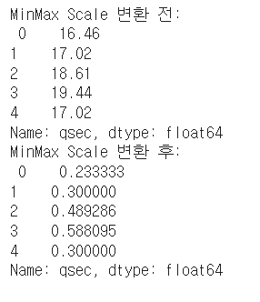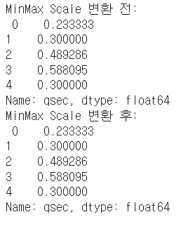 print('MinMax Scale 변환 후: \n', data['qsec'].head())