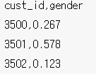 문제) 백화점 고객의 1년간 구매 데이터에서 고객의 성별 예측값(남자일 확률)을 다음과 같은 형식의 CSV 파일로 생성하시오.