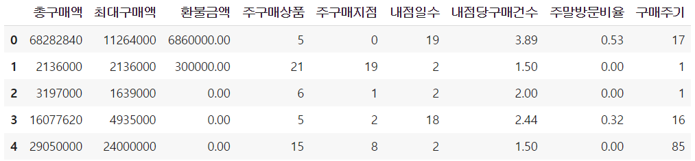 cols = ['총구매액', '최대구매액', '환불금액', '내점일수', '내점당구매건수', '주말방문비율', '구매주기']