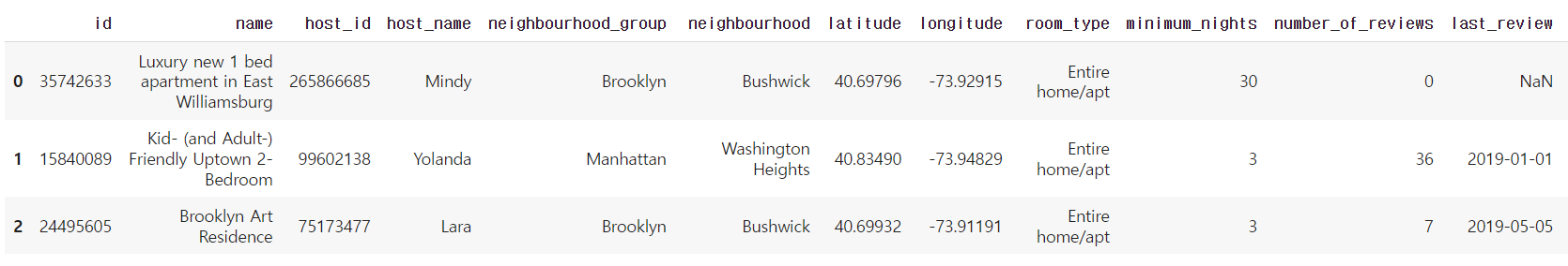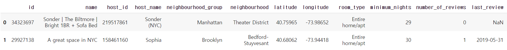 → 'name', 'host_name', 'last_review', 'host_id' 컬럼을 제거 후 컬럼이 16개에서 12개로 줄어들었다.
