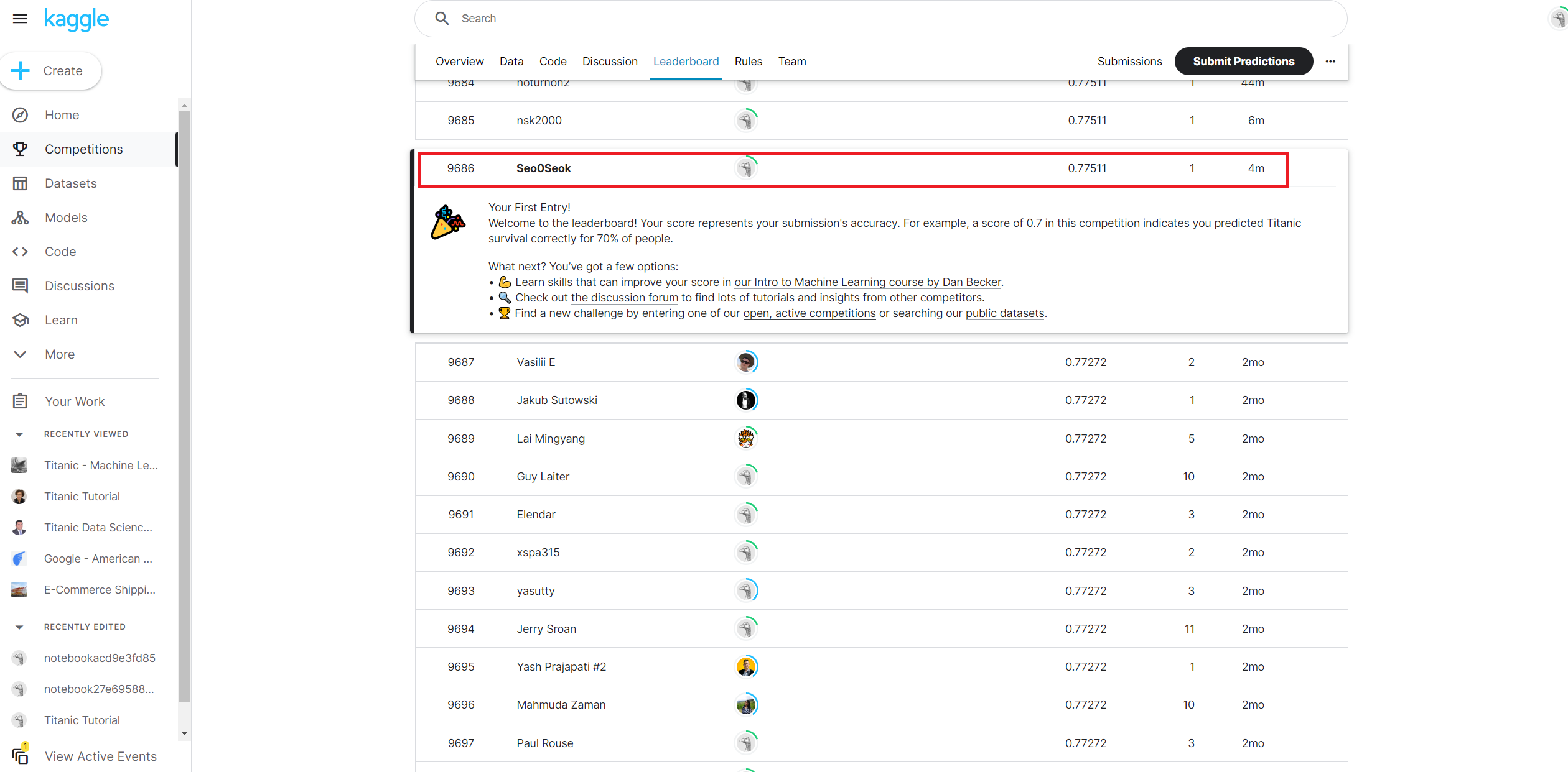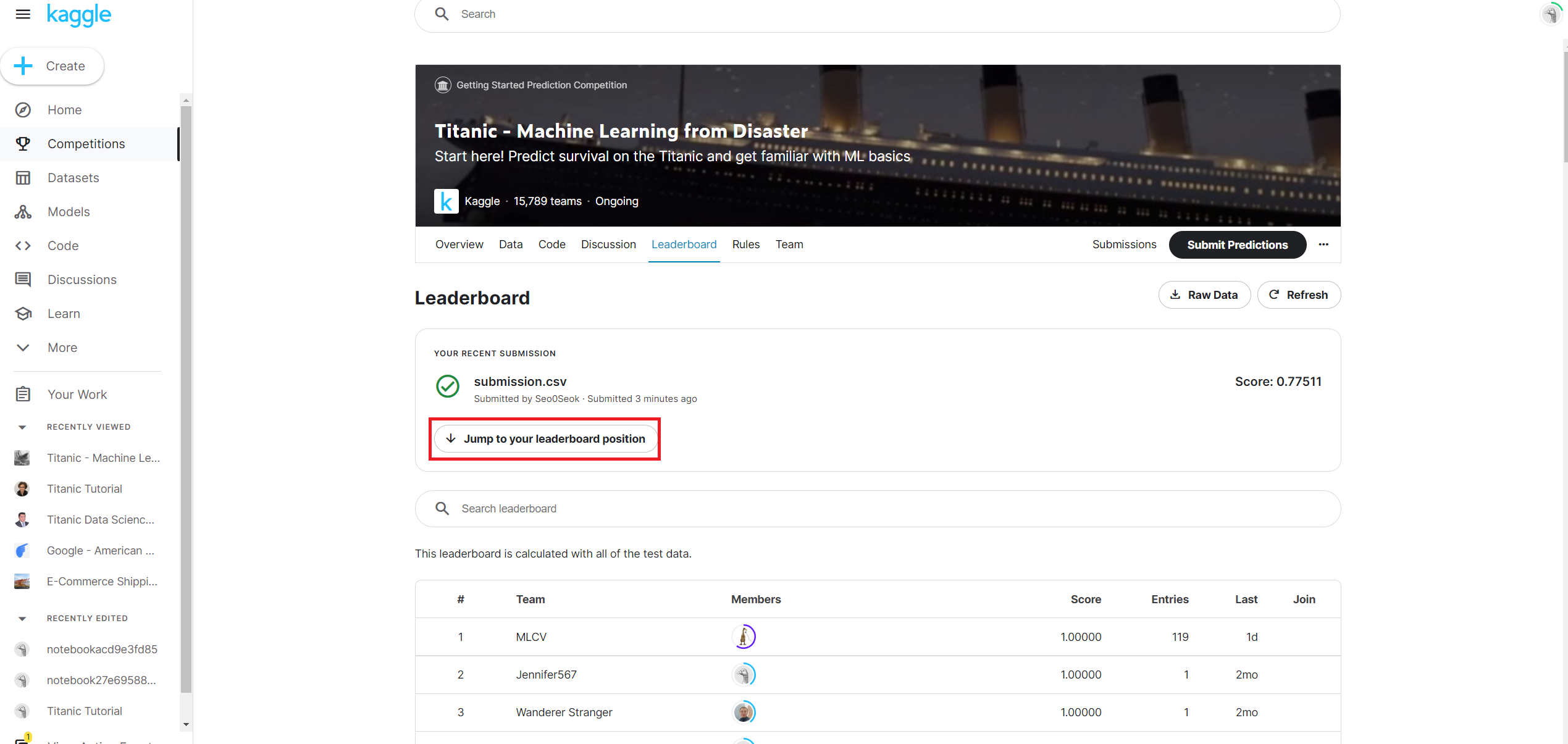 → 다시 Learderboard로 돌아와 Jump to your leaderboard position을 클릭하면 내 등수와 점수가 나온다.