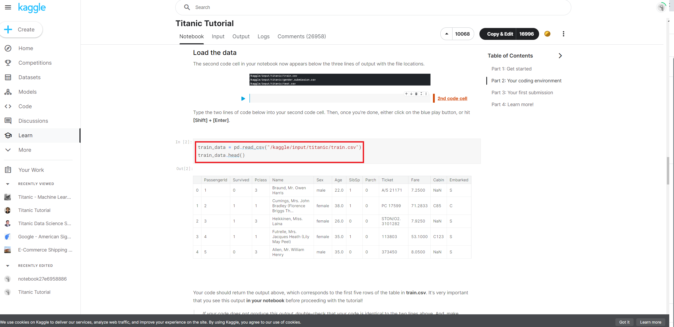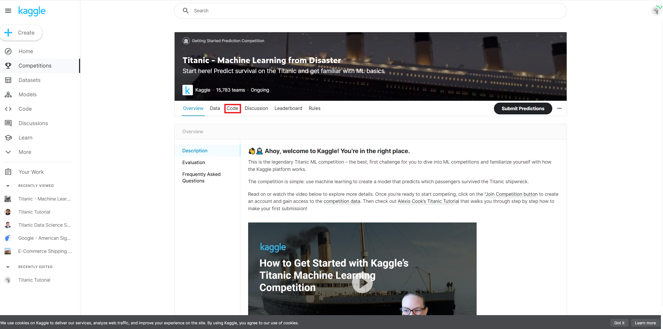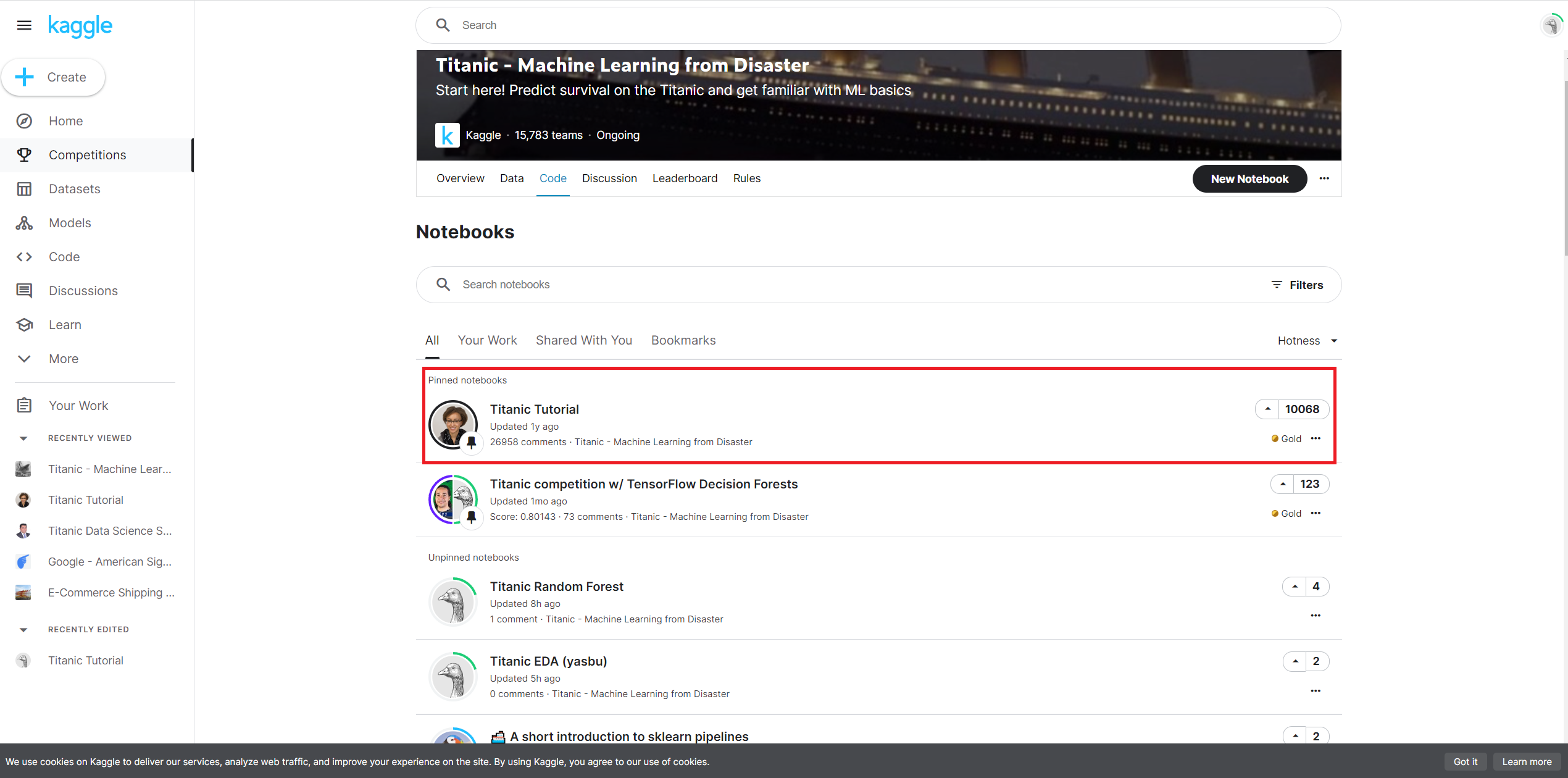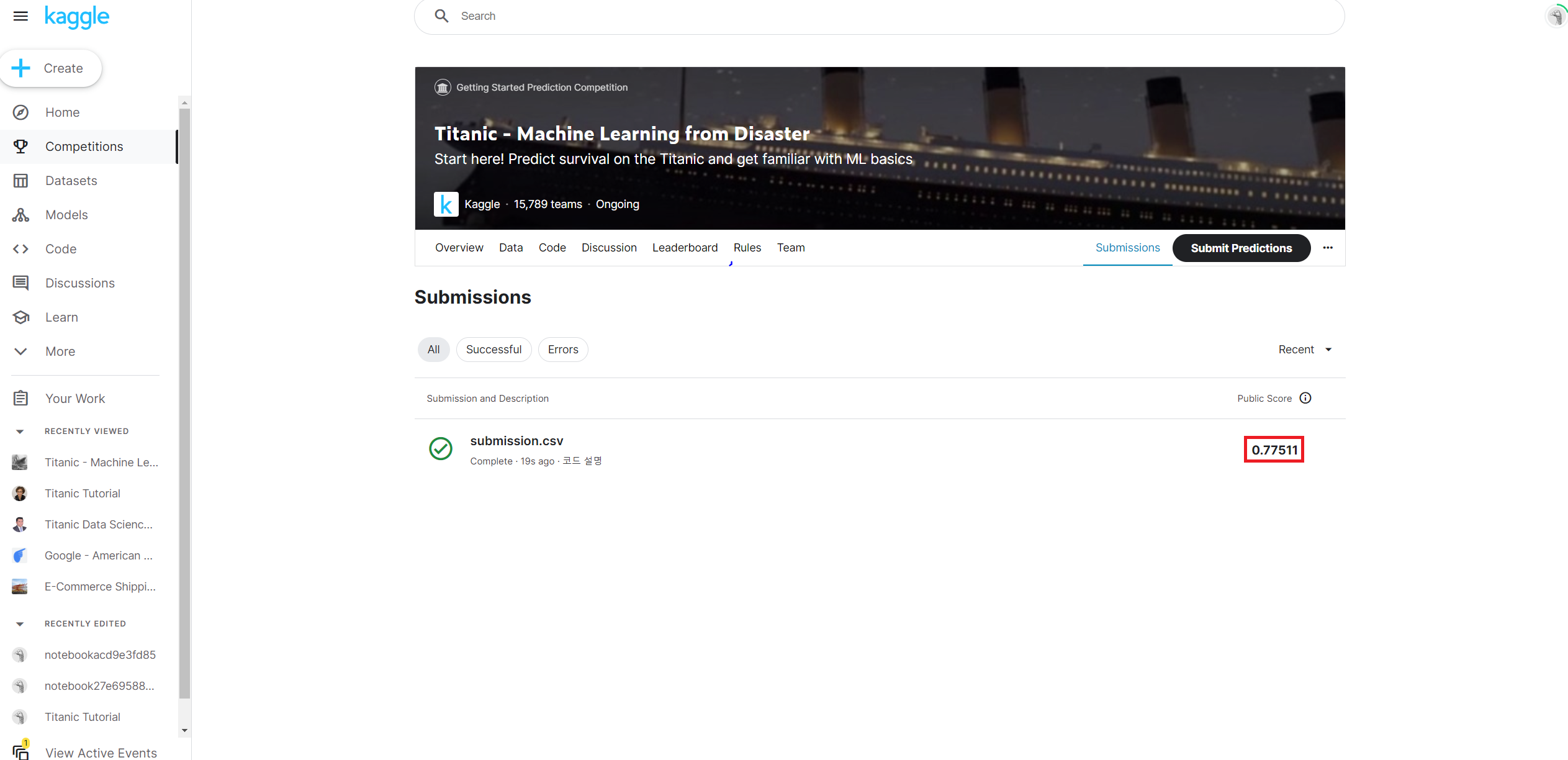 → Titanic Tutorial 클릭 후 글쓴이의 코드를 따라 써보면서 공부를 하면된다.