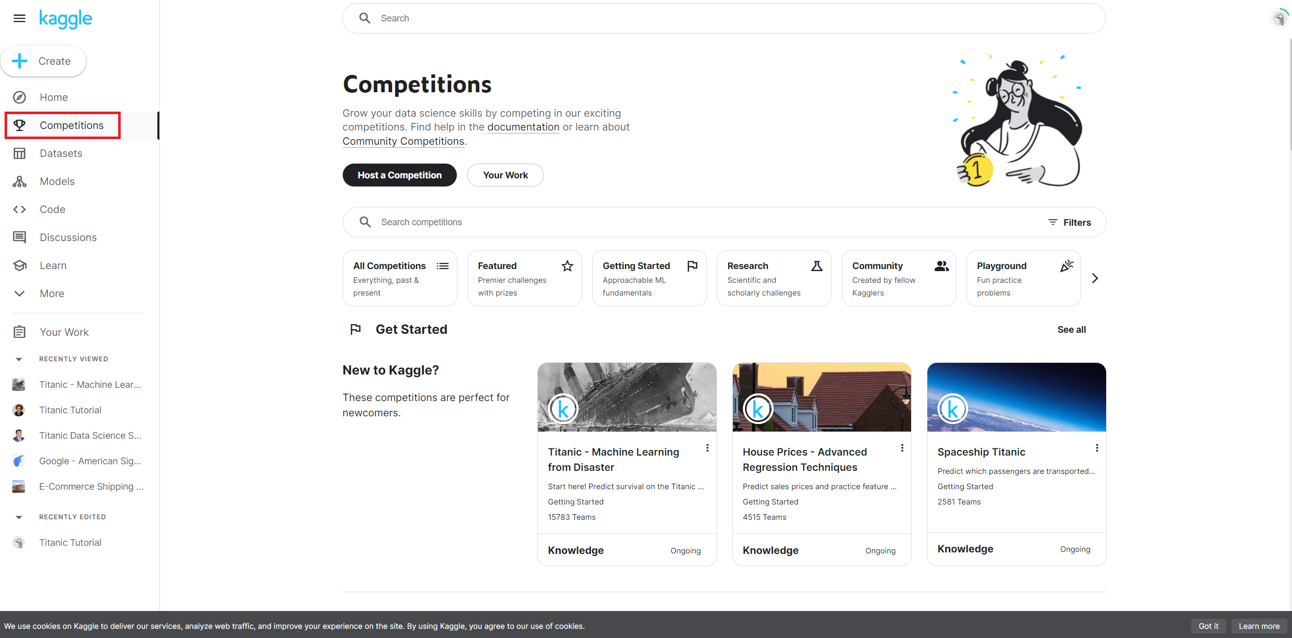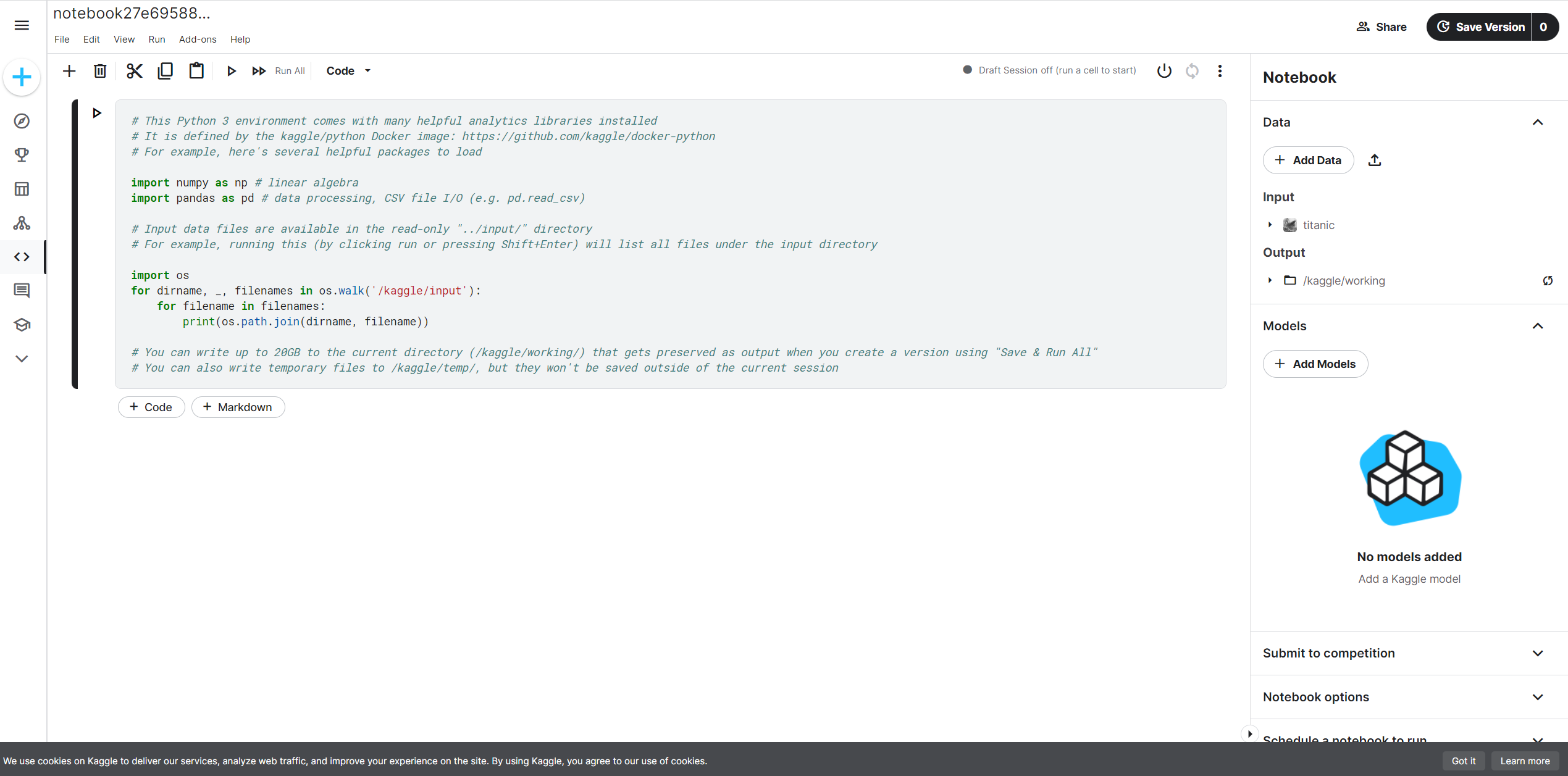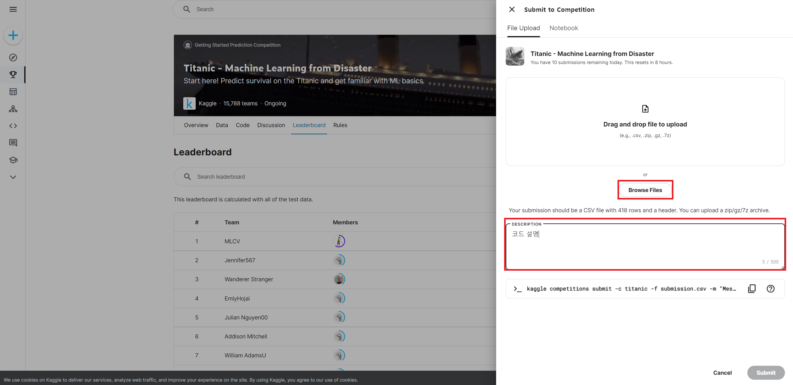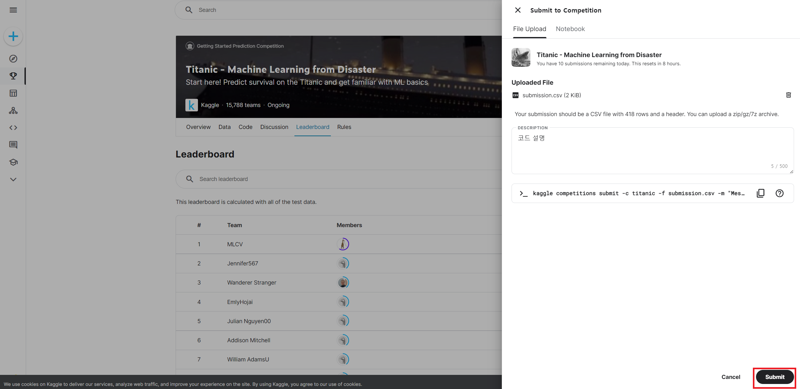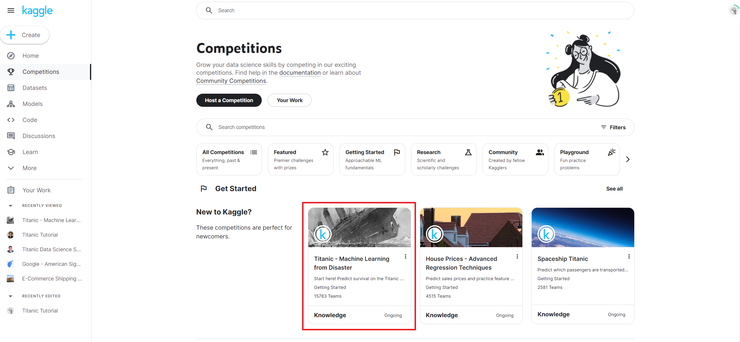 → Titanic Tutorial 클릭 후 글쓴이의 코드를 따라 써보면서 공부를 하면된다.