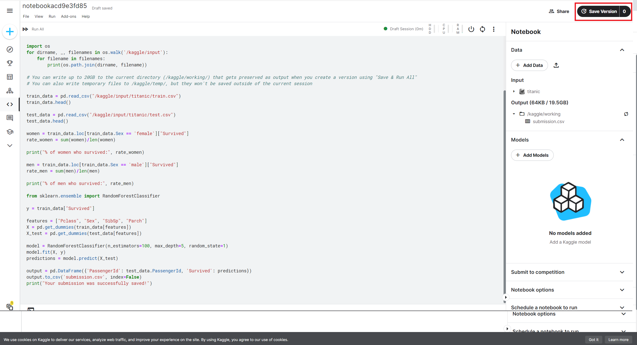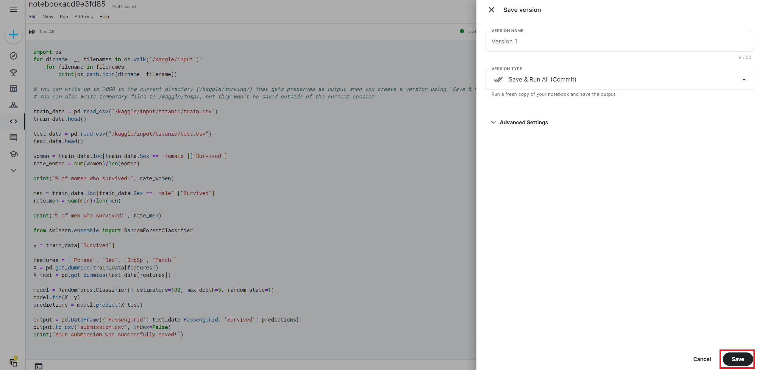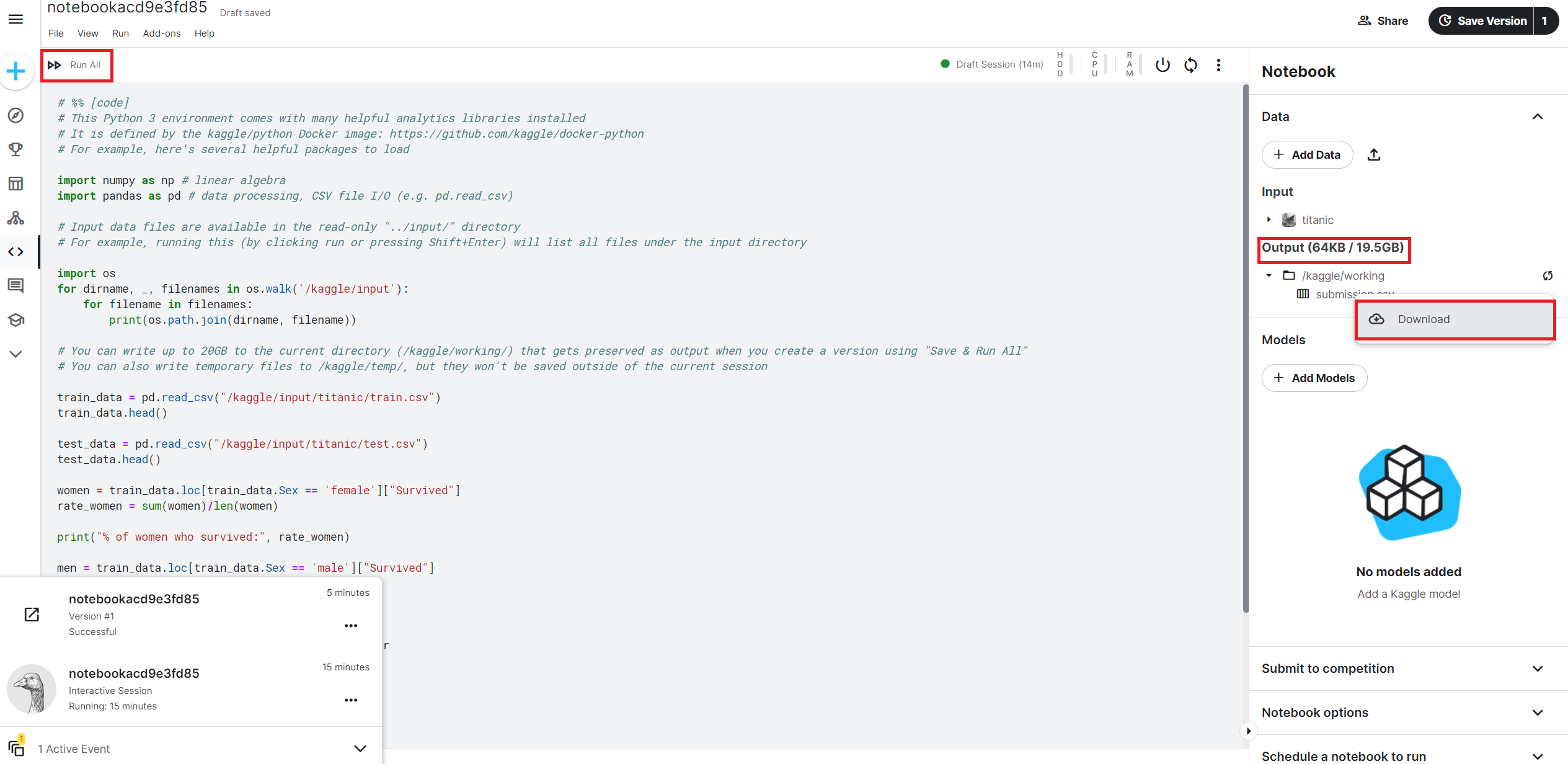 → 코드를 전부 입력 후 Run All을 클릭해 제출용 csv 파일까지 만들었다면 오른쪽에 Output에 csv이 저장이 된다.
