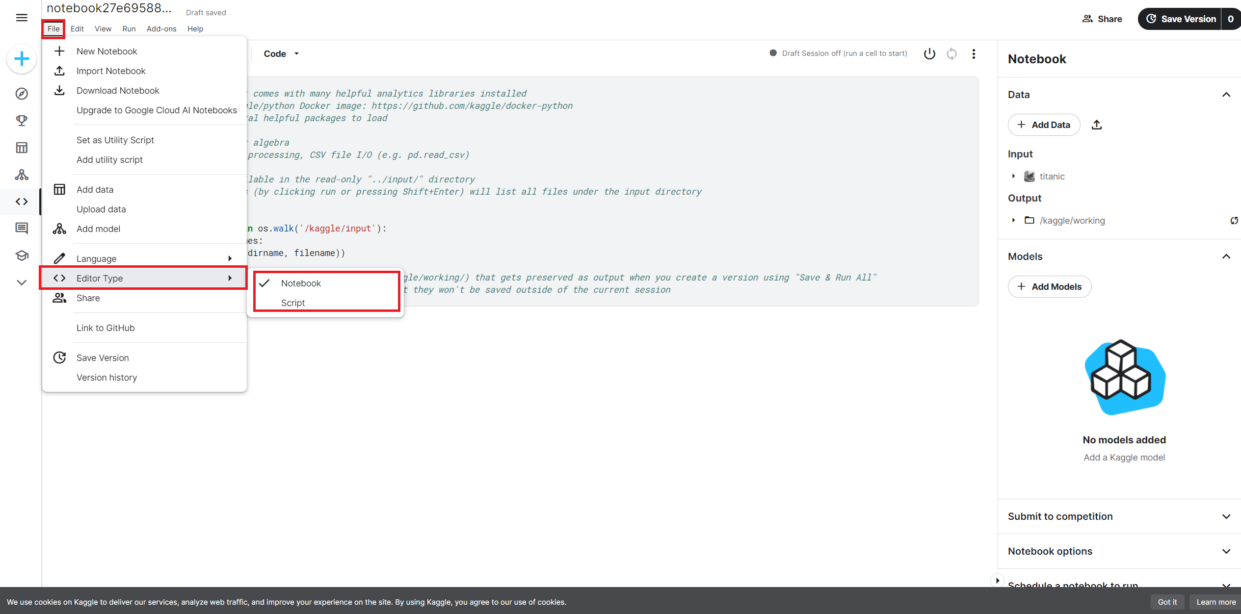 → File 클릭 후 Editor Type에서 Notebook 형태와 Script(시험 환경 유사) 형태로 바꿀 수 있다.