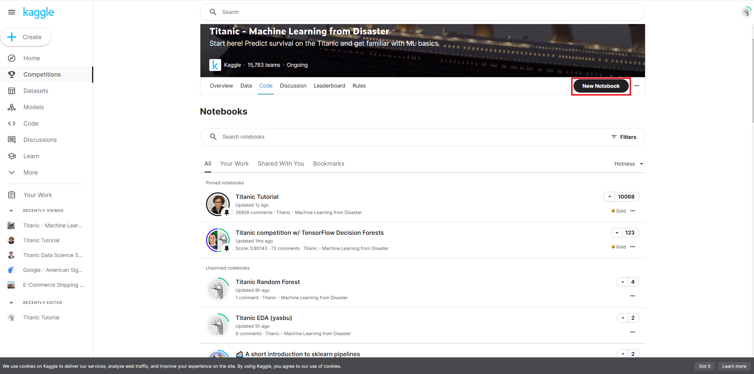 → 인터넷 창을 한 개 더 띄워 똑같이 Titanic Dataset 클릭하여 들어온 후 New Notebook 버튼을 클릭한다.