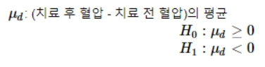 문제) 주어진 데이터(data/blood_pressure.csv)에는고혈압 환자 120명의 치료 전후의 혈압이 저장되어 있다. 해당 치료가 효과가 있는지 (즉, 치료 후의 혈압이 감소했는지) 쌍체표본 t-검정(paired t-test)를 통해 답하고자 한다. 가설은 아래와 같다.