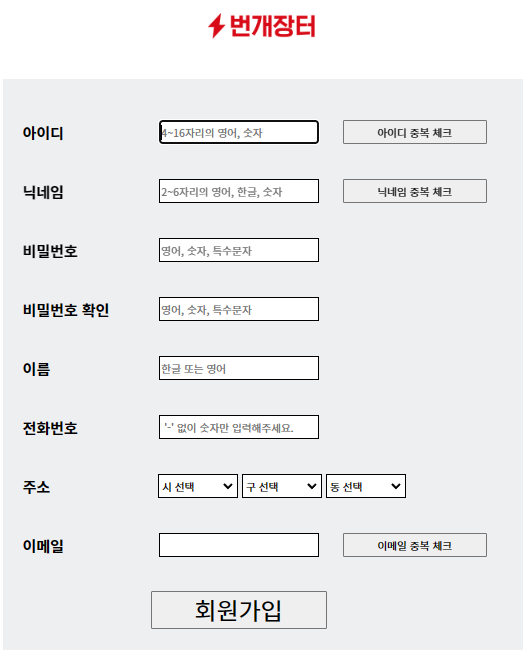 - 회원가입 버튼 클릭시 모든 항목 입력 여부 체크 후 성공 시 회원가입이 완료되었습니다. 메시지 출력 후 메인화면으로 이동 실패 시 oo 항목을 입력해주세요. 메시지 출력