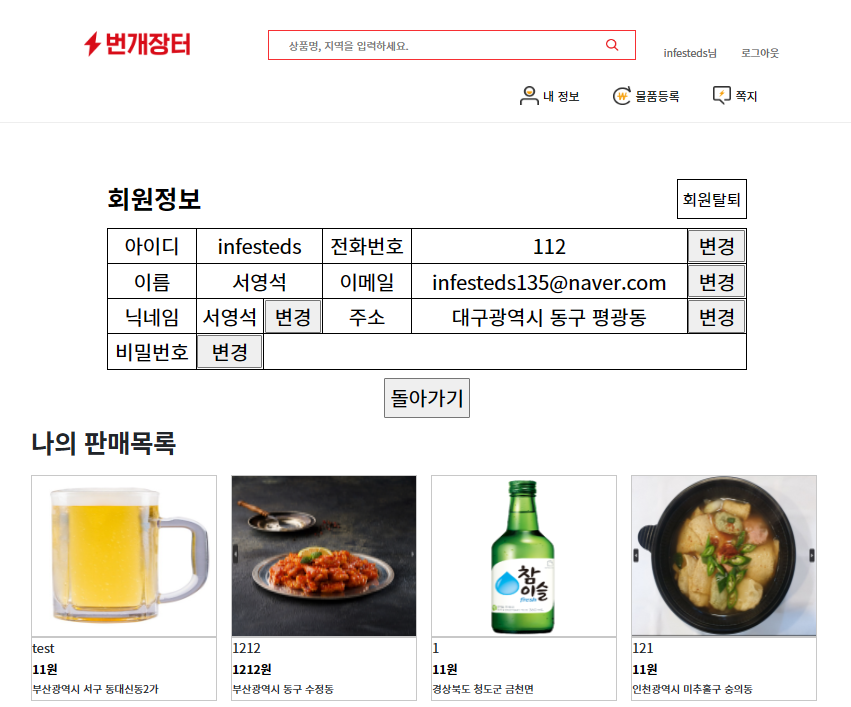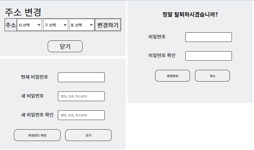 3.6 주소변경 / 비밀번호 변경 / 회원탈퇴 페이지 및 기능