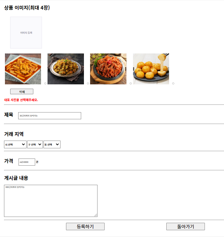 - 제목, 거래 지역, 가격, 게시글 내용 입력 후 등록하기 버튼 클릭 시 상품이 등록되었습니다. 메시지 출력 후 홈 화면 이동 또는 미작성한 항목 있을 시 oo항목을 입력해주세요. 메시지 출력