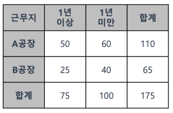 문제) A공장과 B공장 임직원 간의 근무기간 비율에 차이가 있는가?