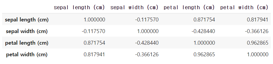 → 문제의 'sepal length (cm)', 'sepal width (cm)' 의 상관계수를 loc()함수를 사용해 직접 뽑아낸다.