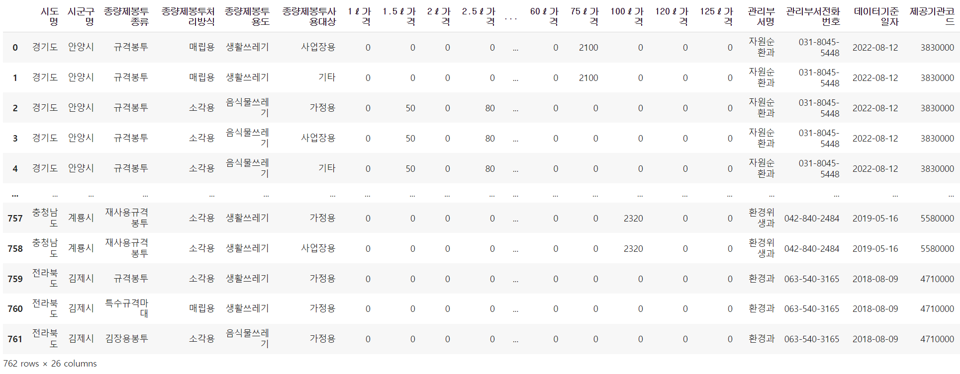 → '2L가격'이 '0원'이 아닌 조건1 / '종량제봉투종류'가 '규격봉투'인 조건2 / '종량제봉투용도'가 '음식물쓰레기인 조건3