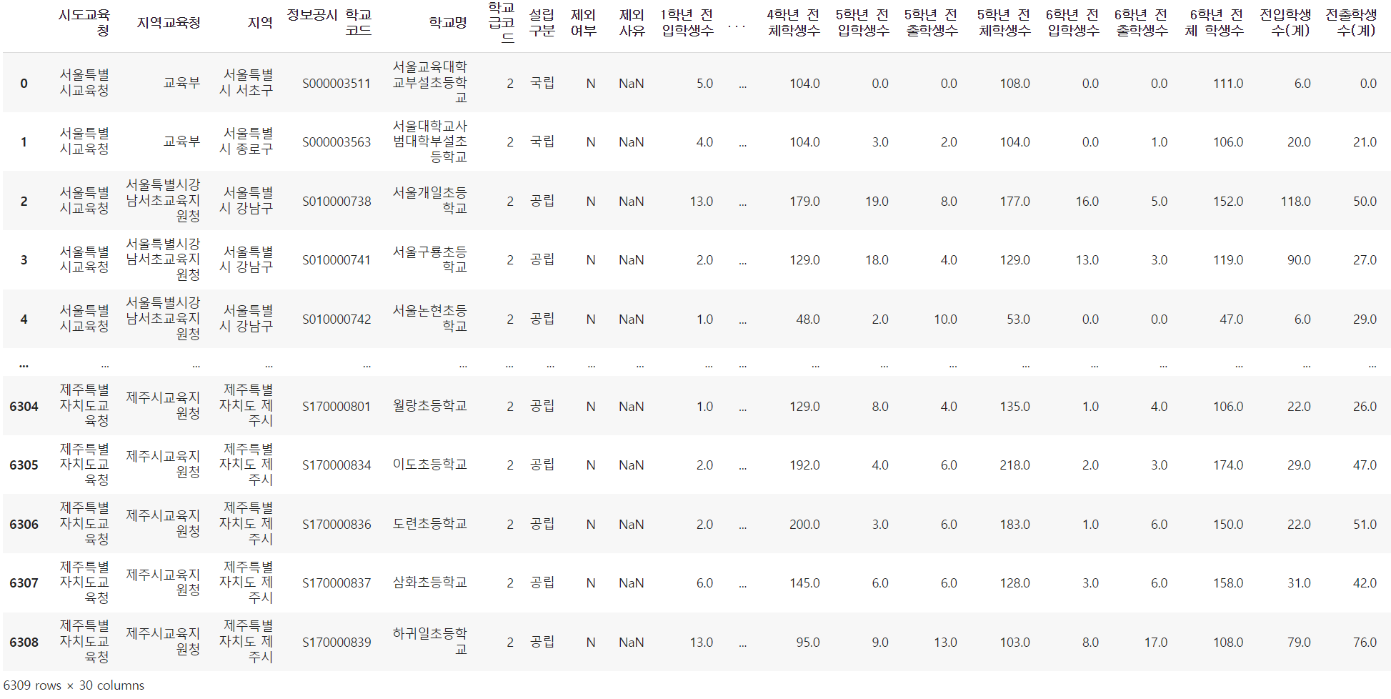 → iloc() 함수를 통해 첫 번째 행의 '전체학생수' 컬럼을 선택한 후 int를 씌워 출력하면 230명이 나온다.