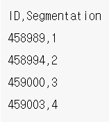 → 문제에서 제시한 형식대로 'ID'와 'Segmentation' 컬럼에 test_ID와 pred값을 넣어 데이터프레임으로 만든 후 제출