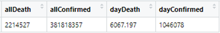 global <- total %>% summarise(allDeath = sum(Deaths), allConfirmed = sum(Confirmed),
