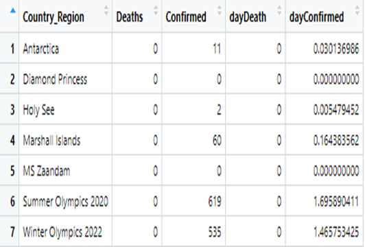 결과값을 통해 Antarctica, Diamond Princess를 비롯한 총 7개 지역의 코로나 환자 사망자 집계가 0으로 입력되고 있음을 확인할 수 있다. 하지만 이 중 Diamond Princess, Holy See, MS Zaandam, Summer Olympics 2020, Winter Olympics 2022는 지역이 아니다. 이 외의 Antarctica(남극), Marshall Islands(마셸제도)만 지역(국가)이다. Antarctica(남극), Marshall Islands(마셸제도)는 지리적 특성상 집계가 원활히 이루어 지지 않아, 코로나19 환자가 존재하지 않는 것으로 결과가 나타나고 있는 가능성이 크다. 그러나 해당 지역들의 집계 누락 및 소외 지역 취급에 대한 유의 필요성은 여전히 존재한다. 이러한 집계 결과가 지속적으로 누적된다면, 해당 지역의 거주자들에 대한 의료 소외로도 이어질 수 있기 때문이다. 즉, 해당 지역 거주자는 범국가적 의료 지원 등을 받을 수 없는 가능성이 높다.