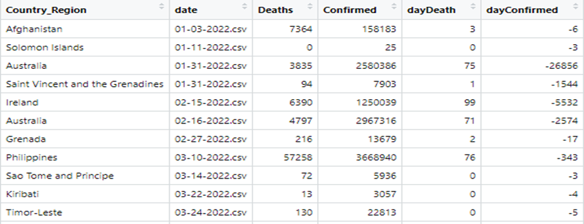 음수값에 대한 데이터 정제 후, 일별 데이터로 분석한 '글로벌 기준 사망자, 확진자, 일평균 사망자, 일평균 확진자'의 수는 아래 사진과 같이 확인할 수 있다.
