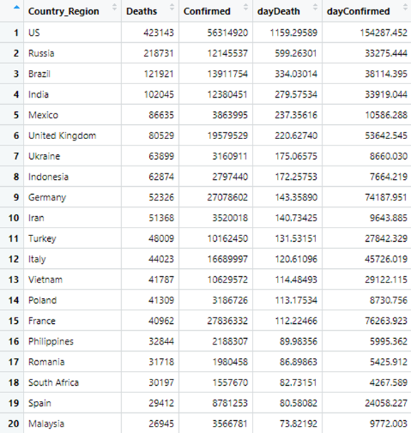 names(covidtotal) <- c("Country_Region","Deaths","Confirmed")